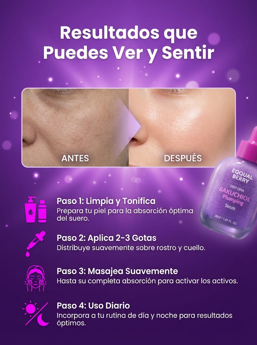 Con la piel limpia y seca, aplica pocas gotas y masajea hasta absorber. Úsalo mañana y noche para mejores resultados.